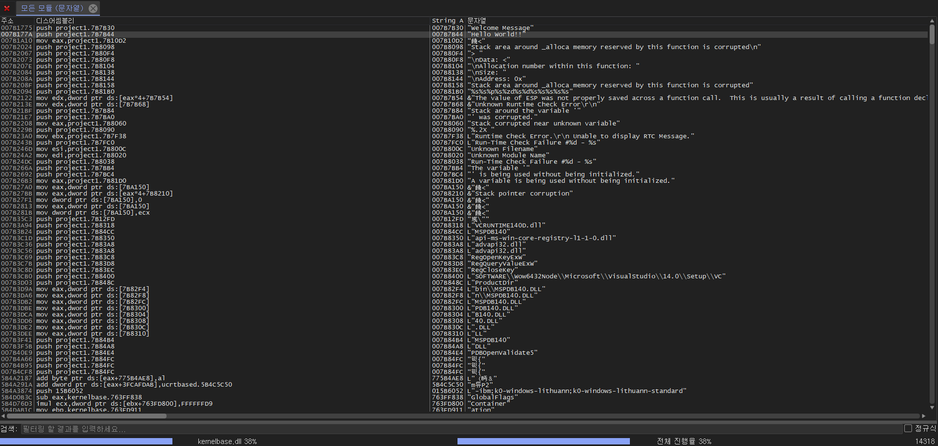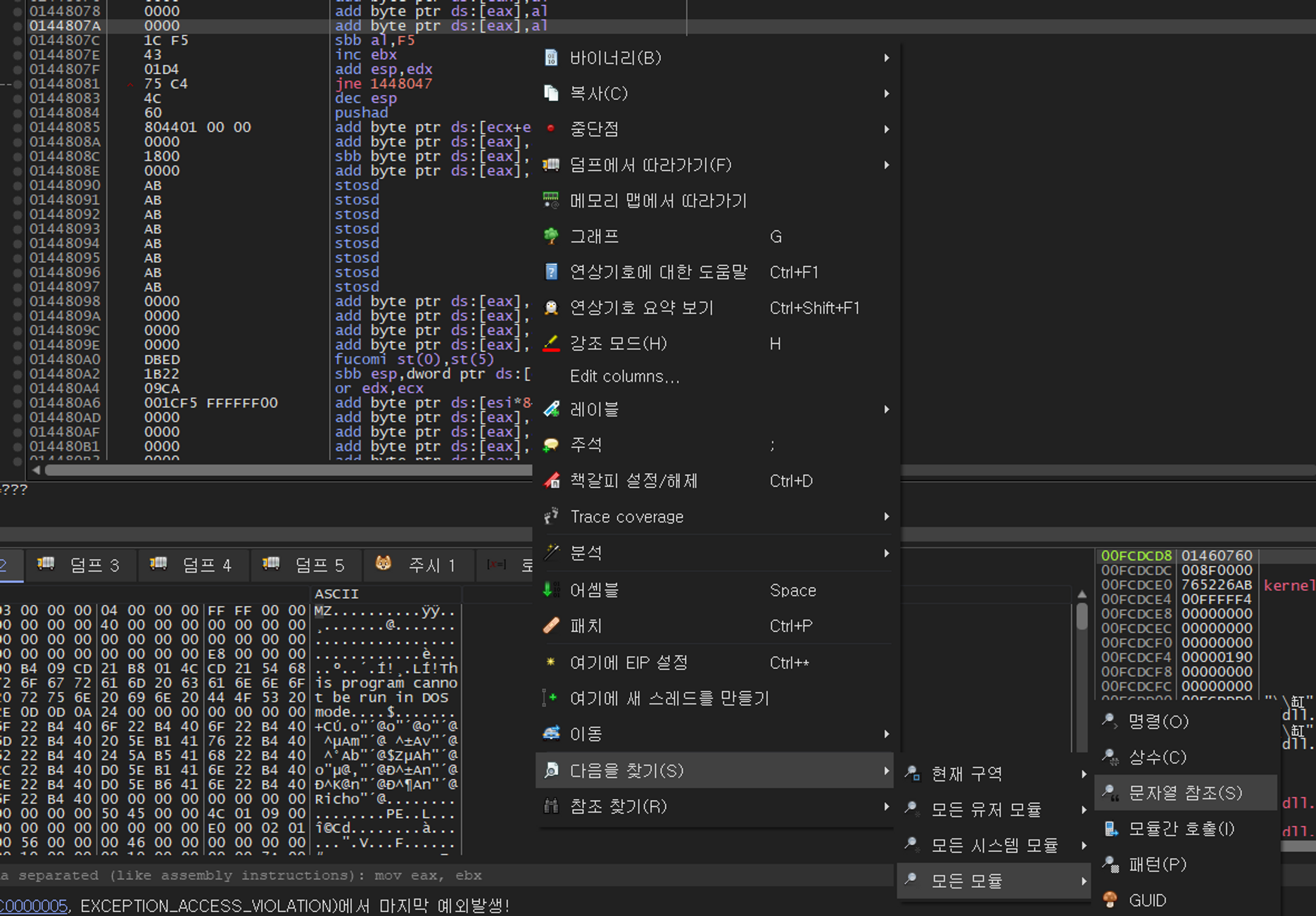 만약 프로그램 실행하는 결과에 특정 문자열이 표시된다면 찾는 방법이 있다. 다음을 찾기에서 3가지 검색 범위가 표시되는데 “현재 구역”은 현재 섹션, “모든 모듈”은 DLL 라이브러리까지 포함하여 선택한다.