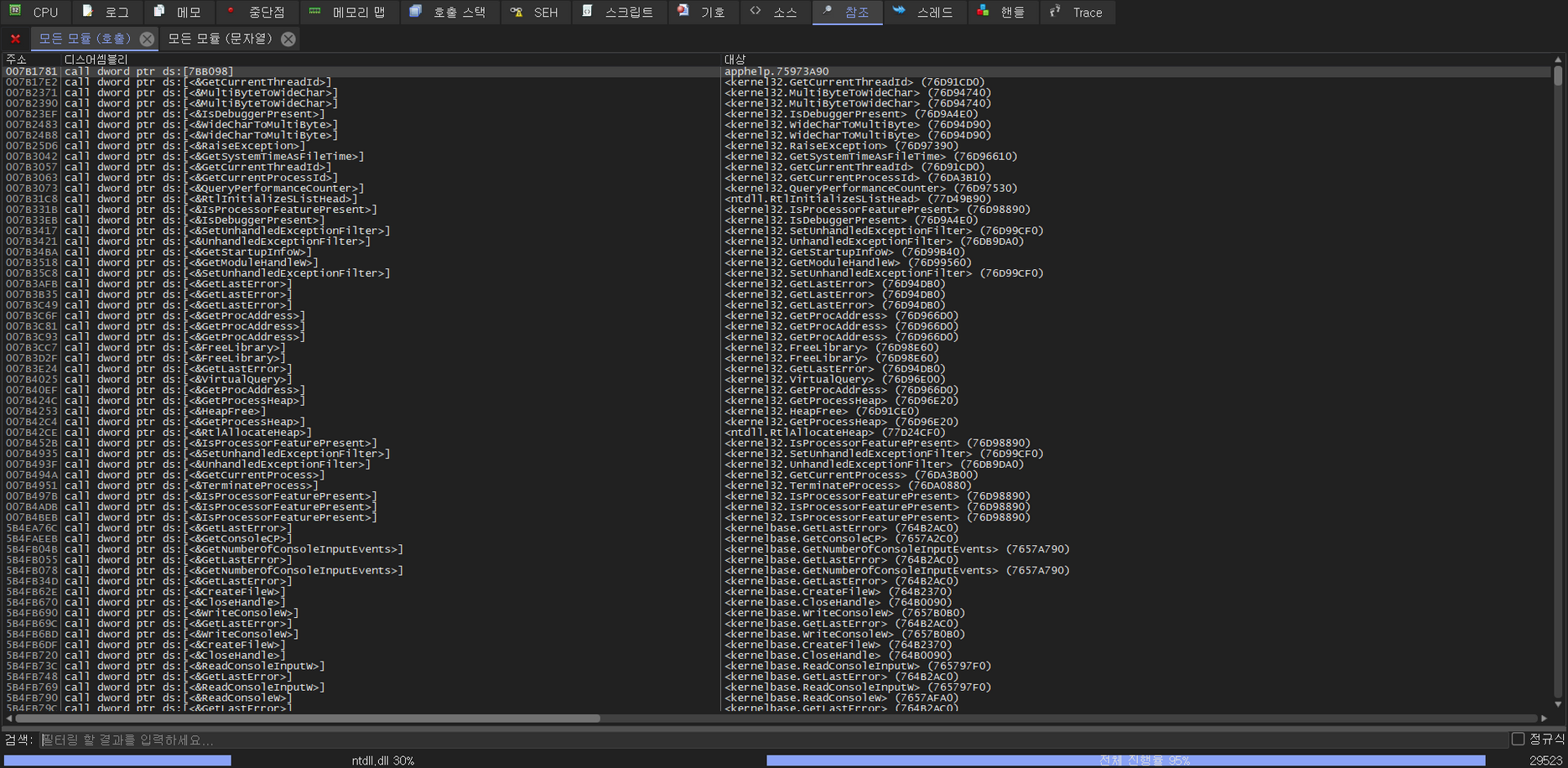 문자열은 ASCII 코드 기준 영어 문자열 위주로 검색된다. 따라서 한글은 검색되지 않는데 이럴 때 유용한 방법이 API 검색이다. 특정 API 검색은 “모듈간 호출(I)”를 선택해 다음과 같은 API가 사용된 곳의 코드가 나타난다.