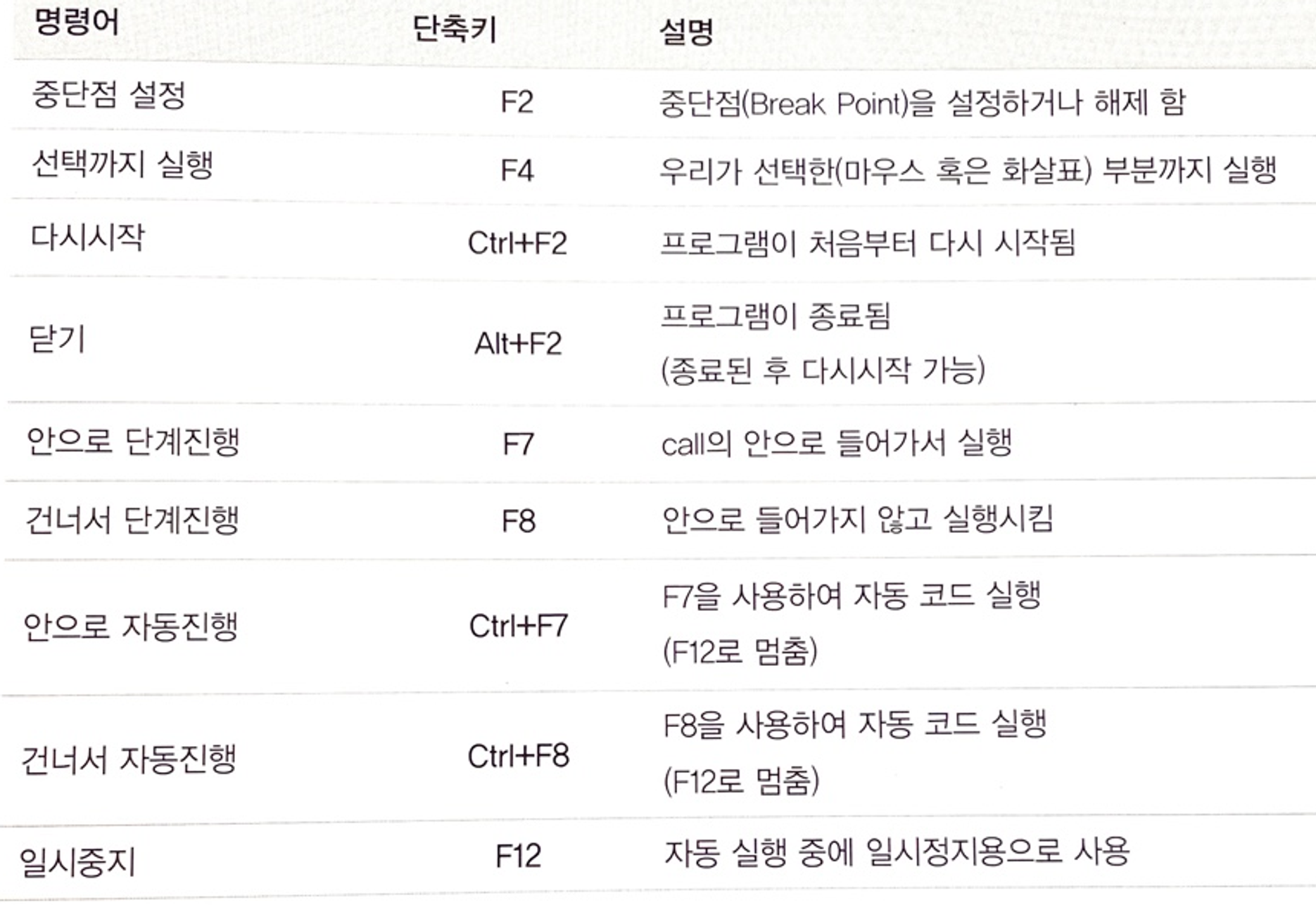 - [F7] 키로 함수 내부를 실행하던 중 함수에서 벗어나고 싶을 경우 [Ctrl+F9]로 함수 끝까지 실행해 벗어날 수 있다.